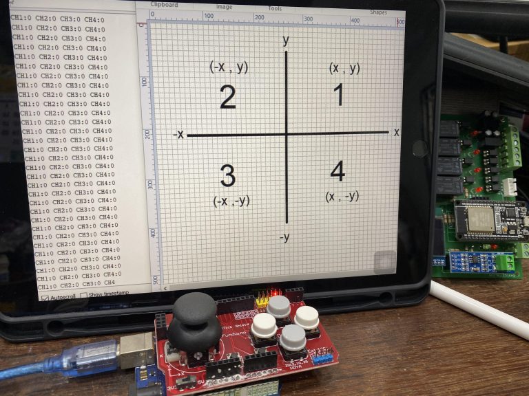 นั่งเปิดหนังสือคณิตศาสตร์ทบทวนความทรงจำ ระบบพิกัดฉาก อืมม...มี แกน x ,แกน y ในคอสเดนท์ต่างๆ ในแกนXY ถ้าเราเอาพิกัด 0,0 เป็นจุดศูนย์กลาง จะแบ่งได้เป็น 4 คอสเดนท์ คือ xy ,-xy ,x-y และ-x-y โจทย์คือหมุนจอยสติก แล้วต้องส่งค่าข้อมูล xy ออกมา 4 ช่อง ดีนะในอดีตเคยตั้งใจเรียนคณิต สบายๆ นั่งก็อปตัดแปะโปรแกรมสิบกว่าบรรทัด เอาตัวรอดไปวันๆครับผม